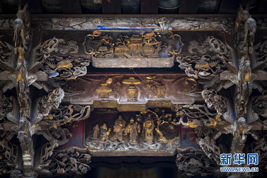 位于石屏縣異龍鎮(zhèn)符家營(yíng)村一戶老屋中“修舊如舊”的房梁(8月8日攝)。新華社記者 江文耀 攝