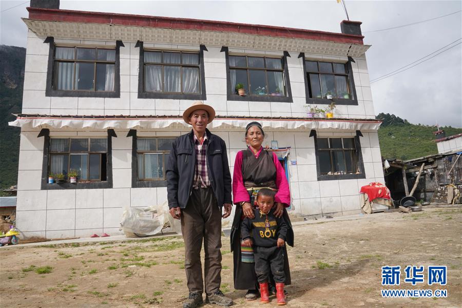 乃村村民次旺多吉、妻子米瑪和孫子尕瑪多吉在自家新房前合影(8月26日攝)。新華社記者 多吉占堆 攝