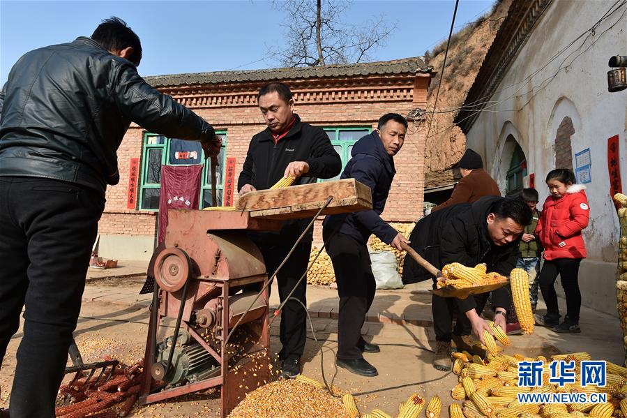 在武鄉(xiāng)縣大有鄉(xiāng)王莊溝村,駐村第一書記靳建中(左二)和扶貧工作隊(duì)隊(duì)員徐乃勤(左三)、常建林(左四)在村民家里幫助村民給玉米脫粒(2月17日攝)。  新華社記者 詹彥 攝