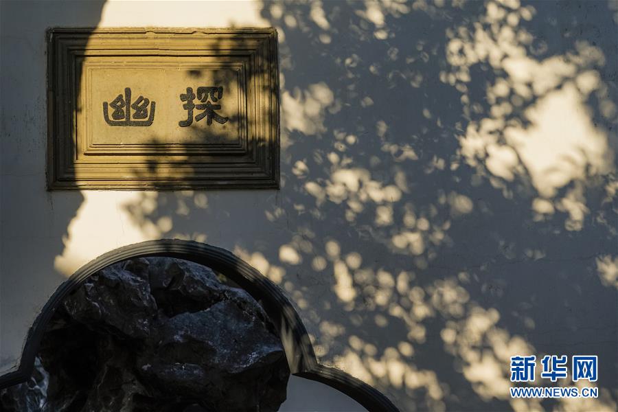 這是蘇州獅子林墻壁上的斑駁樹影(5月23日攝)。 新華社記者 沈伯韓 攝