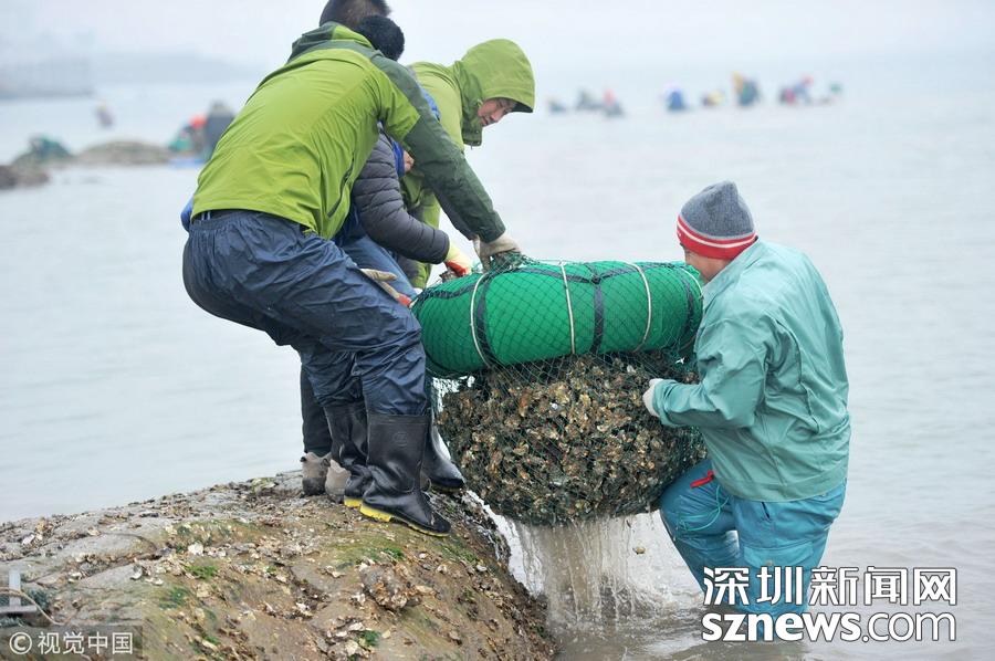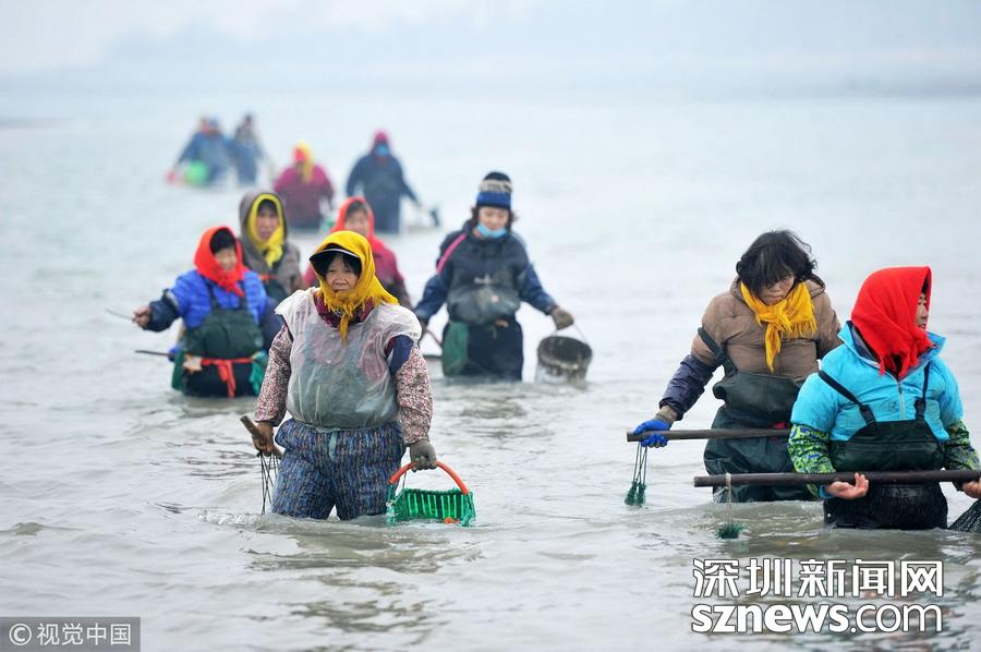 2018年12月22日,山東青島西海岸新區(qū)唐島灣南岸,市民蹚過(guò)海水帶回灣底挖到的海蠣子。