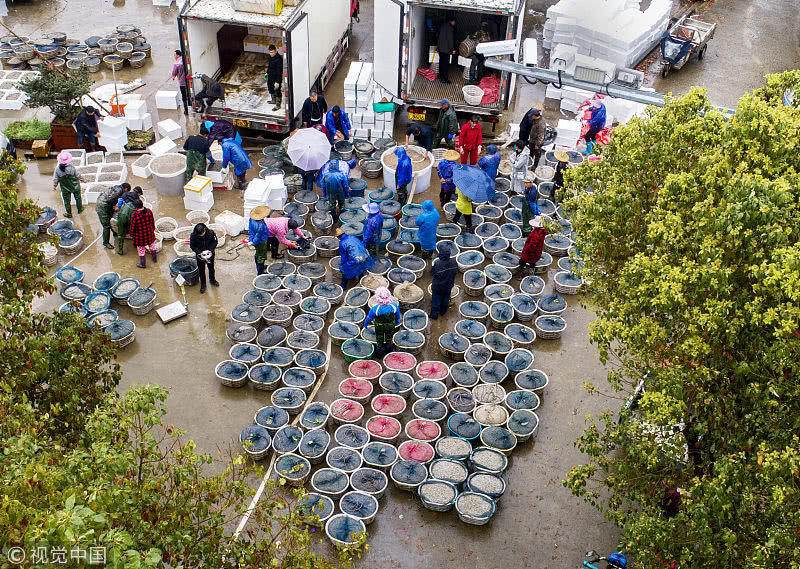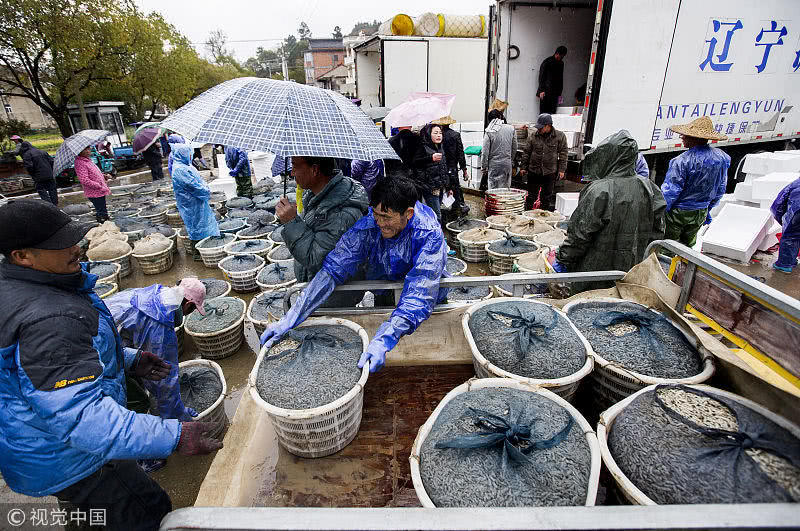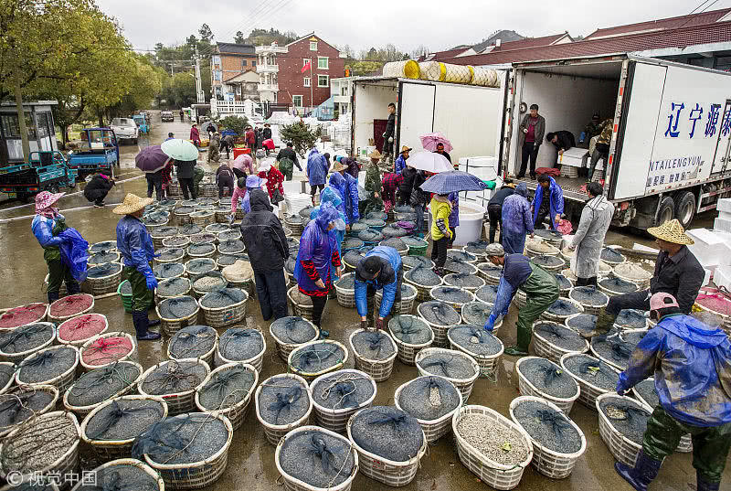 浙江臺(tái)州,三門(mén)縣花橋鎮(zhèn)柵下村的文化禮堂前,村民們冒雨和商販交易蟶苗,現(xiàn)場(chǎng)一片繁忙。據(jù)了解,花橋蟶苗屬于野生苗,存活率高,易成長(zhǎng),極受市場(chǎng)歡迎,一到捕撈季節(jié),遼寧、山東、江蘇和浙江的養(yǎng)殖戶(hù)和蟶苗小販爭(zhēng)相到花橋購(gòu)買(mǎi)優(yōu)質(zhì)蟶苗。