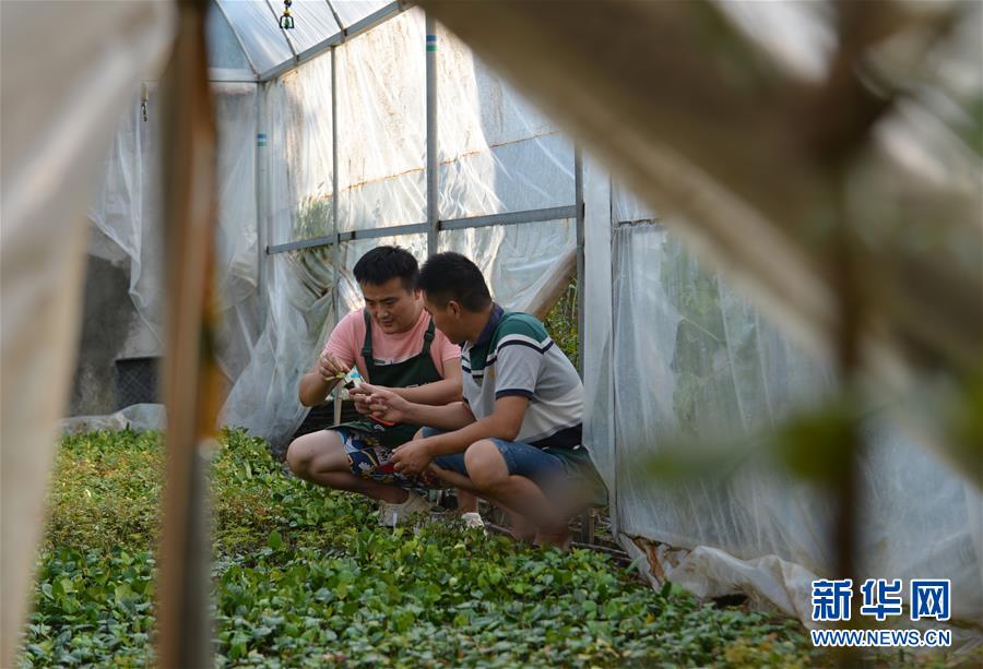 在沭陽縣新河鎮(zhèn)新槐村,張炎(左)在育苗棚內(nèi)和哥哥一起查看月季花幼苗長勢(8月24日攝)。 新華社記者 任鵬飛 攝