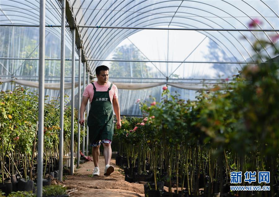 在沭陽縣新河鎮(zhèn)新槐村,張炎在花卉大棚內(nèi)查看月季花長勢(8月24日攝)。 新華社記者 李響 攝