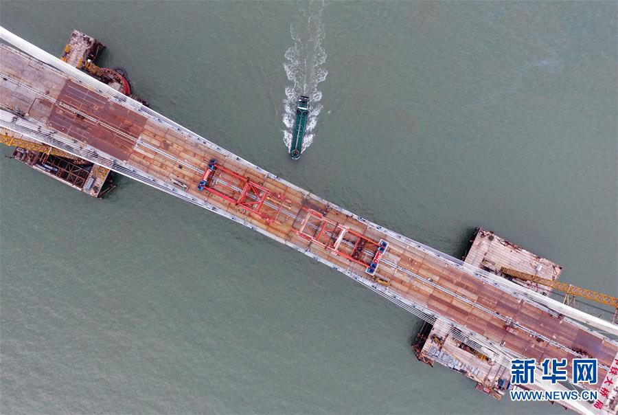 9月21日,平潭海峽公鐵大橋鼓嶼門(mén)航道橋的鋼桁梁在吊裝中(無(wú)人機(jī)拍攝)。新華社記者林善傳攝