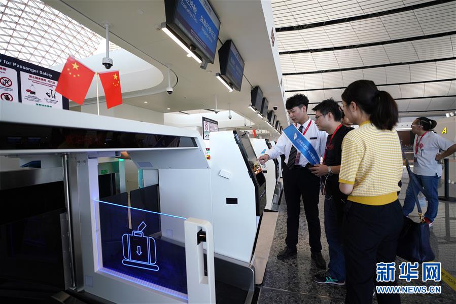 9月25日,中國南方航空公司工作人員(左)在北京大興國際機場介紹自助行李托運設備。新華社記者鞠煥宗攝