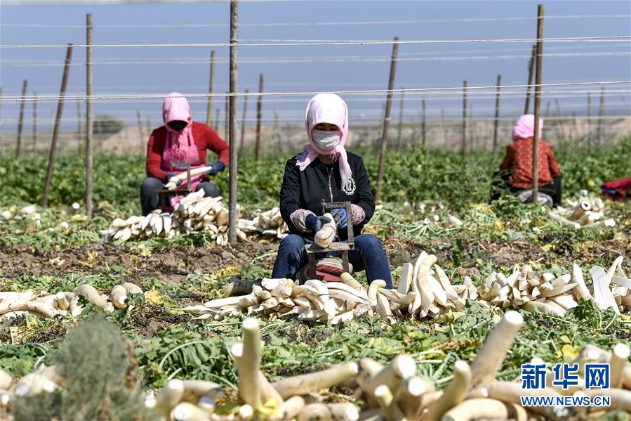 9月30日,寧夏吳忠市紅寺堡區(qū)馬渠生態(tài)移民安置區(qū)的農民在將蘿卜切條。 新華社記者 馮開華 攝