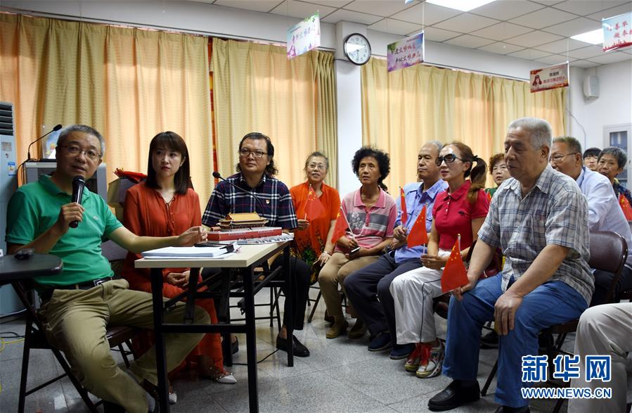 10月1日,在天津市和平區(qū)昆明路社區(qū)黨群服務(wù)中心,天津“心目影院”創(chuàng)始人鄭偉(左一)和兩位講解員在為視障人士“直播”慶祝中華人民共和國成立70周年大會的盛況。當日是國慶節(jié),全國各地的人們用各種方式歡度節(jié)日。新華社記者 宋瑞 攝