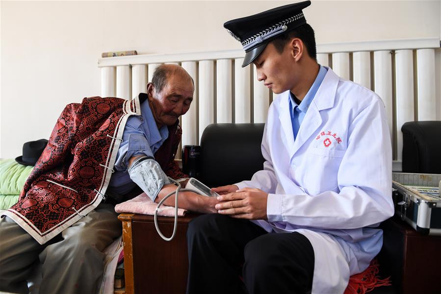 9月25日,內蒙古自治區(qū)額濟納旗算井子邊境派出所的衛(wèi)生員陳亞偉(右)給牧民黨德爾進行體檢。新華社記者劉磊攝
