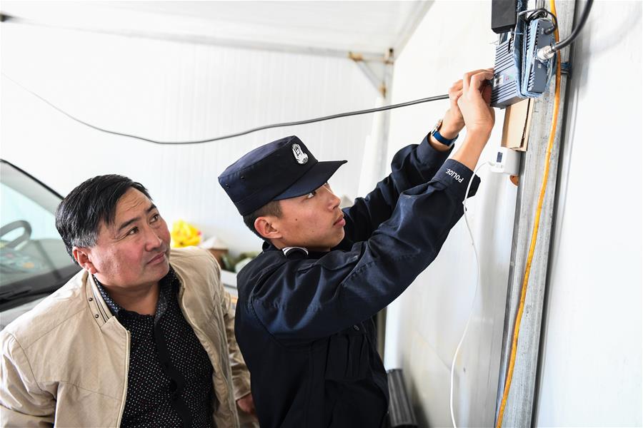 9月25日,內蒙古自治區(qū)額濟納旗算井子邊境派出所民警崔現浦(右)在幫牧民敖其爾修理家用電器。新華社記者劉磊攝