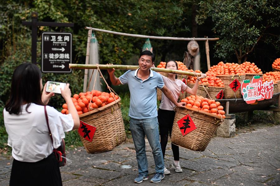 10月3日,游客在西溪國家濕地公園挑起道具“柿子”留影。據(jù)了解,西溪濕地內(nèi)共有柿子樹7000多棵,正值豐收的季節(jié)。 當(dāng)日是國慶假期第三天,大批游客來到位于杭州的西溪國家濕地公園游玩,在江南詩意的環(huán)境中休閑度假。 新華社記者 黃宗治 攝