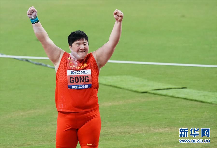 當(dāng)日,在卡塔爾多哈舉行的2019國際田聯(lián)世界田徑錦標(biāo)賽女子鉛球決賽中,衛(wèi)冕冠軍、中國選手鞏立姣以19米55的成績奪得冠軍。 新華社記者王麗莉攝