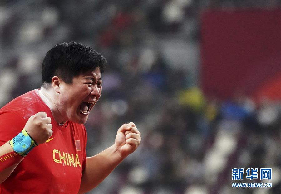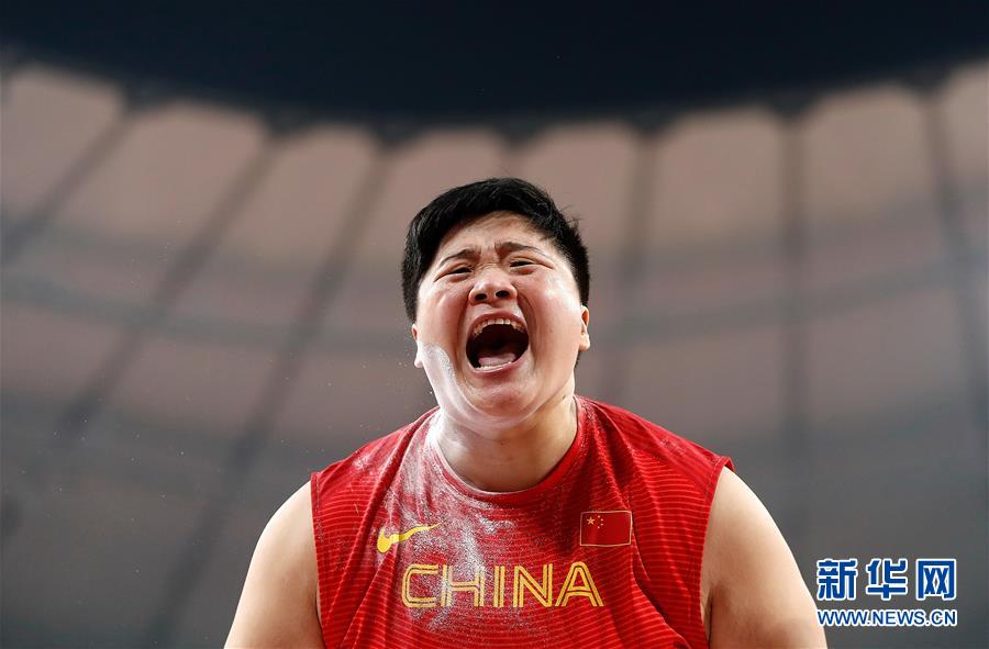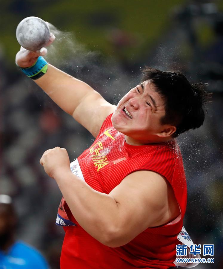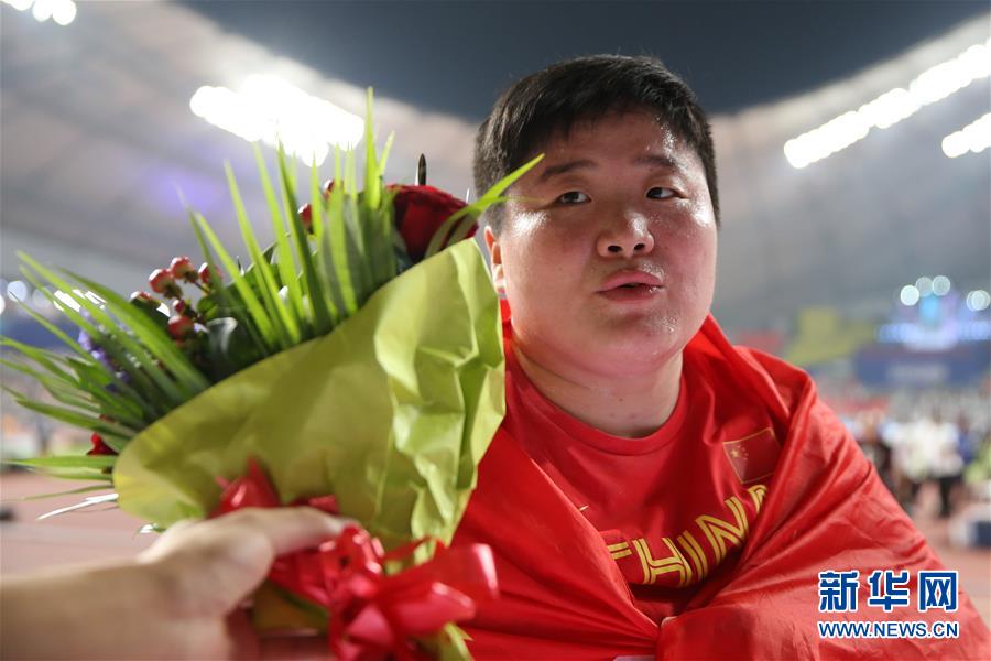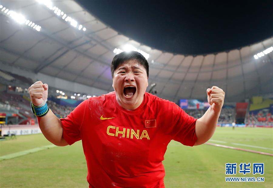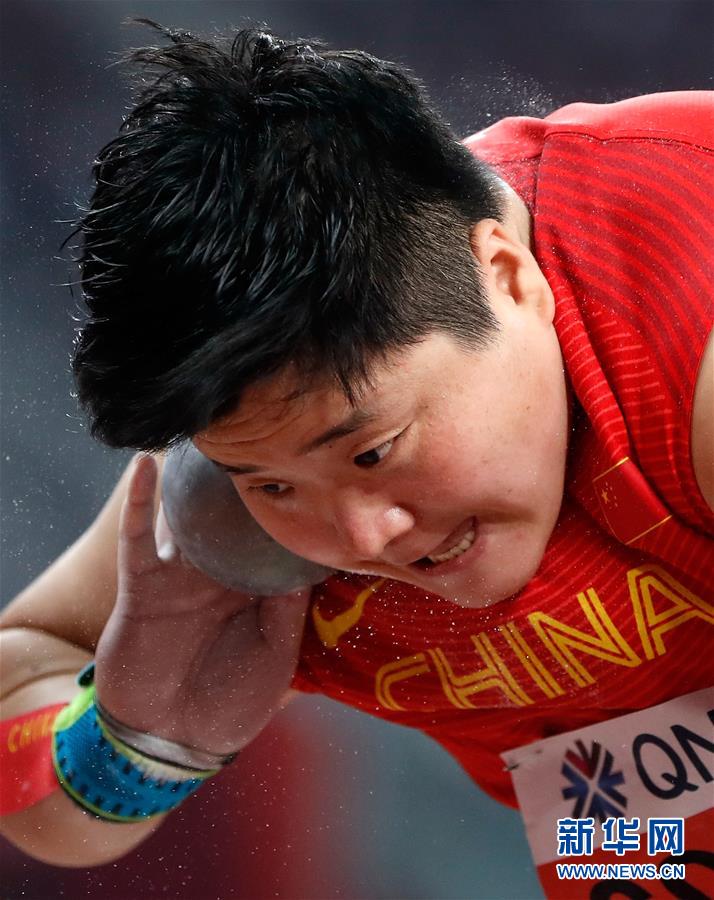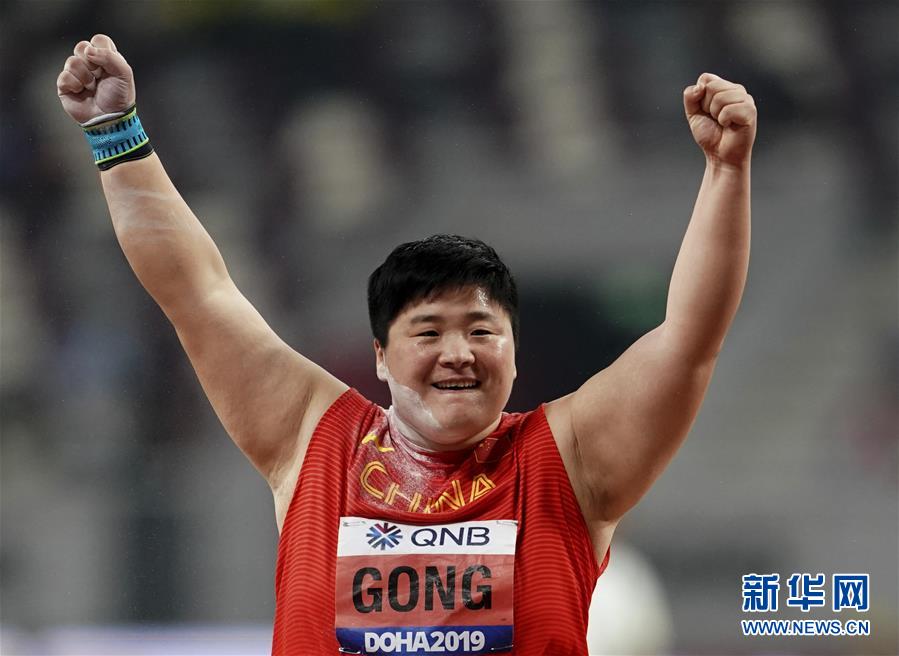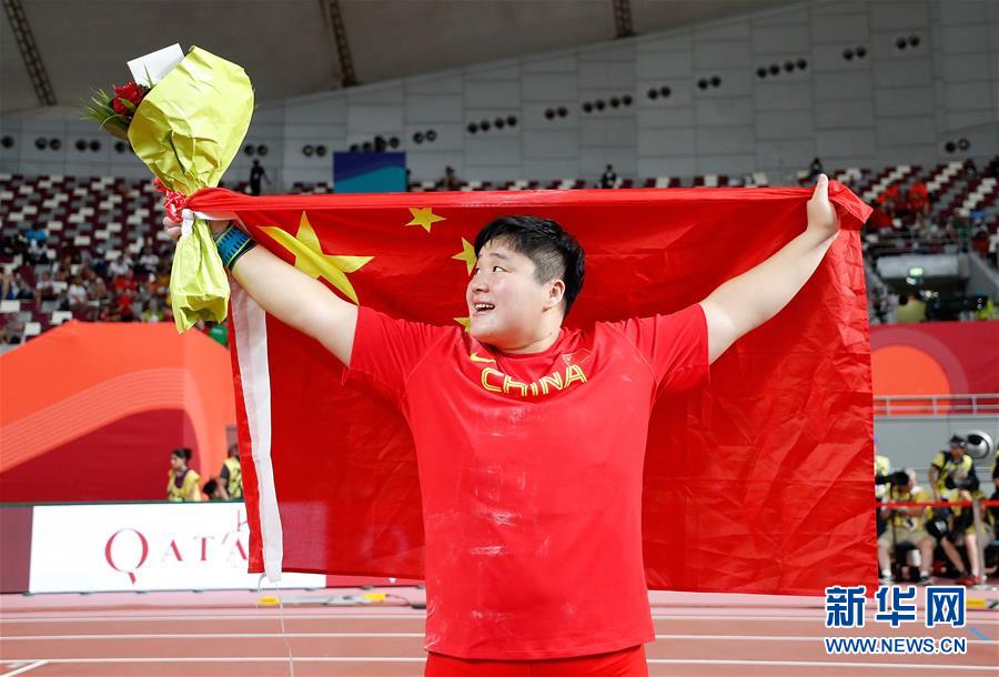 當(dāng)日,在卡塔爾多哈舉行的2019國際田聯(lián)世界田徑錦標(biāo)賽女子鉛球決賽中,衛(wèi)冕冠軍、中國選手鞏立姣以19米55的成績奪得冠軍。 新華社記者王婧嬙攝