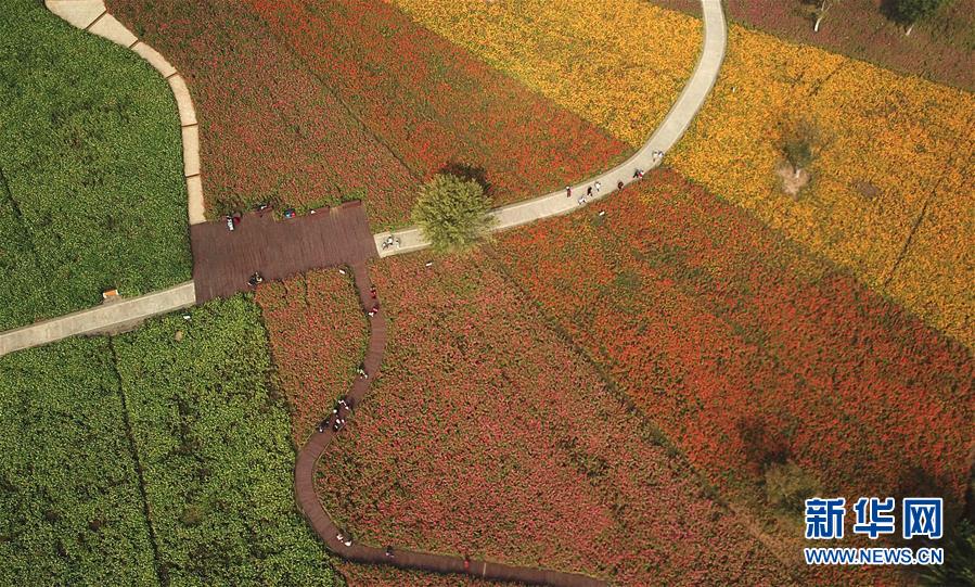 10月9日,游人在四季花海城市公園游覽(無人機拍攝)。 秋日時節(jié),位于安徽省合肥市的四季花海城市公園花香四溢,色彩繽紛,成為游客和市民休閑游玩的好去處。 新華社記者 張端 攝