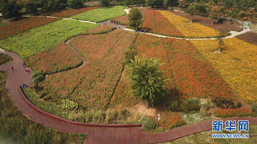10月9日無人機拍攝的四季花海城市公園風(fēng)景。 秋日時節(jié),位于安徽省合肥市的四季花海城市公園花香四溢,色彩繽紛,成為游客和市民休閑游玩的好去處。 新華社記者 張端 攝