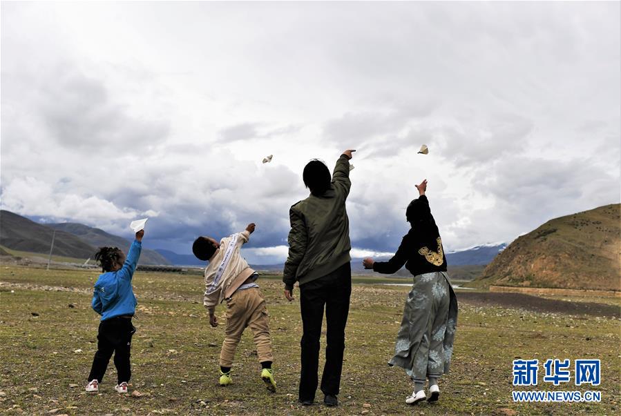 堅(jiān)熱益西(右二)在牧區(qū)和弟弟妹妹一起放飛紙飛機(jī)(7月13日攝)。新華社記者普布扎西攝