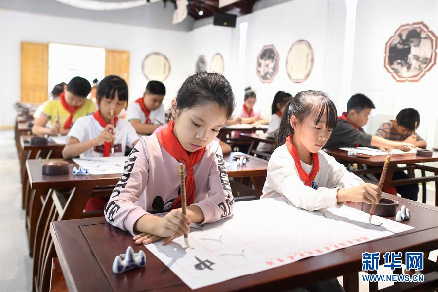 10月14日,小學(xué)生在非遺活態(tài)傳承館使用湖筆練習(xí)書(shū)法。 新華社記者 黃宗治 攝