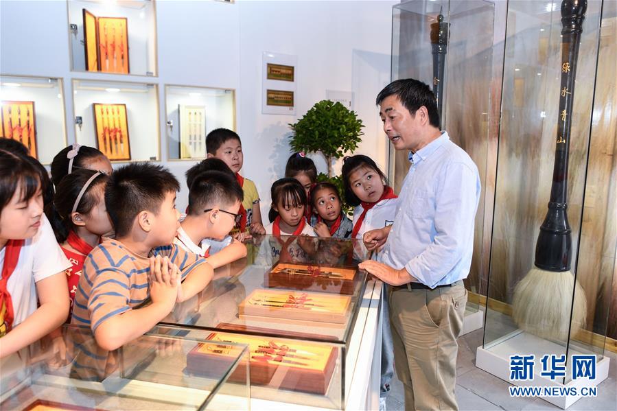 10月14日,小學(xué)生在非遺活態(tài)傳承館觀(guān)看湖筆的實(shí)物展示。新華社記者 黃宗治 攝