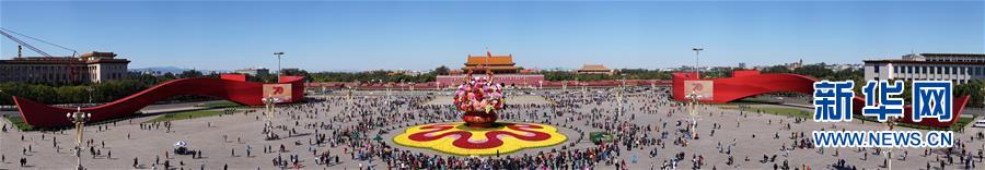 這是10月14日拍攝的天安門廣場中心花壇(全景拼接圖片)。 10月14日,以“花果籃”為主造型的天安門廣場中心花壇吸引了眾多游客參觀拍照?!盎ü@”的夜景更是流光溢彩,絢爛迷人。 新華社記者 殷剛 攝