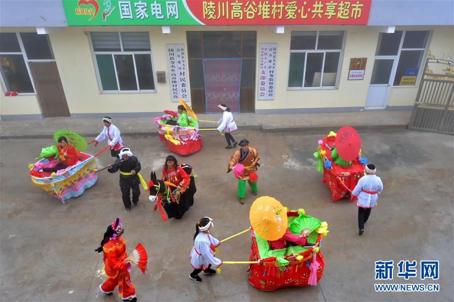 在奪火鄉(xiāng)高谷堆村,村民在排練傳統(tǒng)民俗節(jié)目“推小車”(10月14日攝)。 新華社記者 曹陽 攝