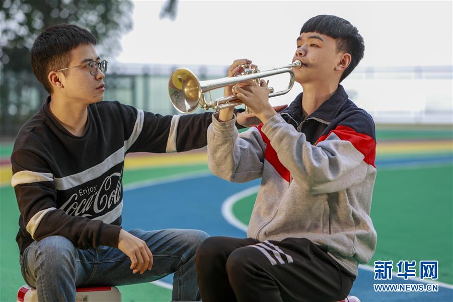 重慶市特殊教育中心的老師李沂念(左一)在教授盲童王太樊練習(xí)小號(10月10日攝)。 新華社記者 劉潺 攝