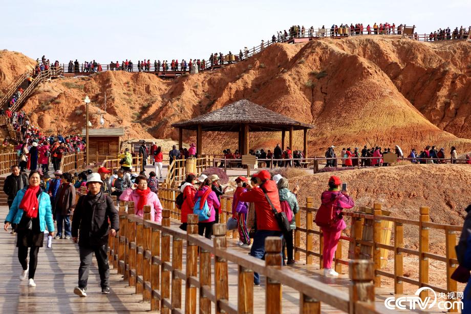 央視網(wǎng)消息:2019年10月15日,金秋時節(jié),位于甘肅省張掖市臨澤縣的七彩丹霞景區(qū)進入旅游旺季,吸引眾多游人紛至沓來。張掖七彩丹霞景區(qū),分布面積約50公里,是中國北方干旱地區(qū)發(fā)育最典型的丹霞地貌。在方圓數(shù)十平方公里的范圍內(nèi),隨處可見有紅、黃、橙、綠、白等多種鮮艷的色塊或線條,把一座座山峰,一條條溝壑,裝點成一幅幅絢麗多姿、燦爛奪目的畫圖。圖片來源:視覺中國