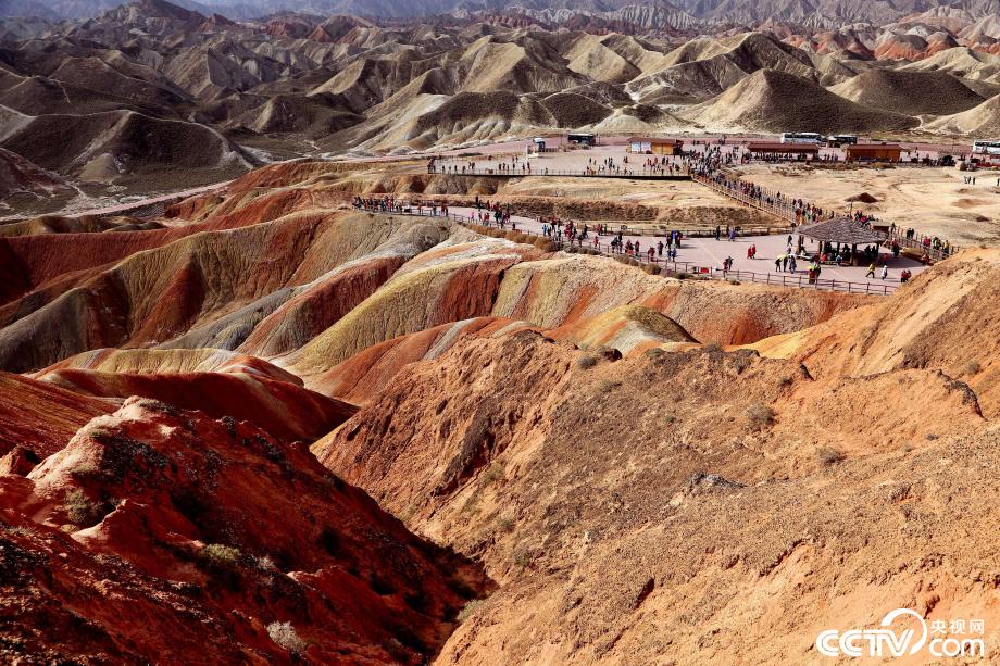 央視網(wǎng)消息:2019年10月15日,金秋時節(jié),位于甘肅省張掖市臨澤縣的七彩丹霞景區(qū)進(jìn)入旅游旺季,吸引眾多游人紛至沓來。張掖七彩丹霞景區(qū),分布面積約50公里,是中國北方干旱地區(qū)發(fā)育最典型的丹霞地貌。在方圓數(shù)十平方公里的范圍內(nèi),隨處可見有紅、黃、橙、綠、白等多種鮮艷的色塊或線條,把一座座山峰,一條條溝壑,裝點(diǎn)成一幅幅絢麗多姿、燦爛奪目的畫圖。圖片來源:視覺中國