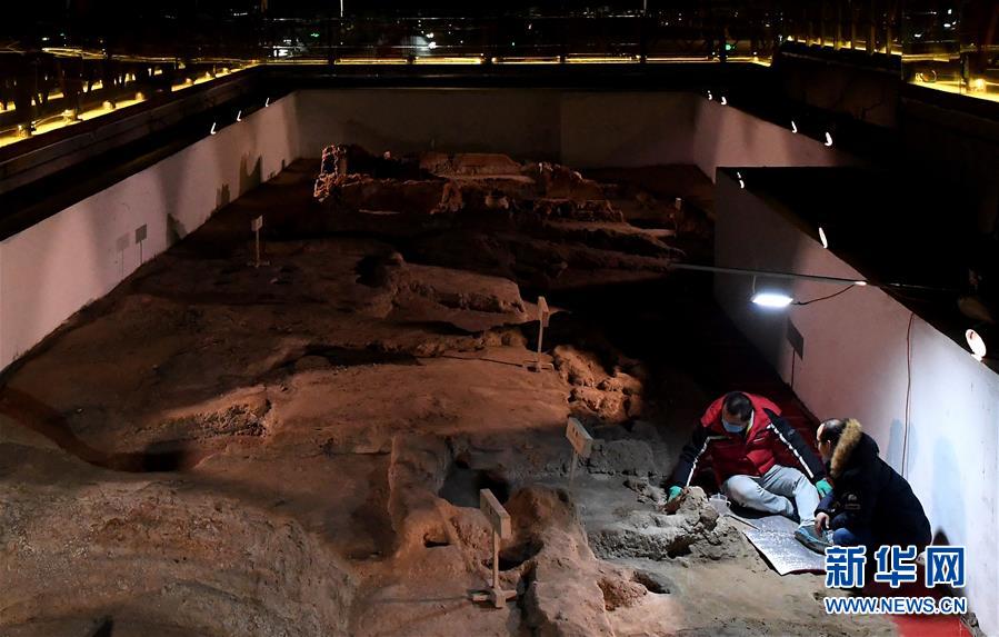 在河南鄭州大河村遺址博物館,科研人員在對仰韶文化房基進行體檢、加固(12月11日攝)。