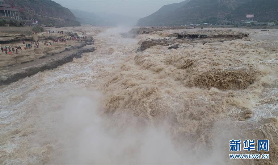 受近日降雨影響,位于山西吉縣的壺口瀑布水量增大,壯美的瀑布群景觀吸引眾多游客前來(lái)觀賞。新華社記者楊晨光攝