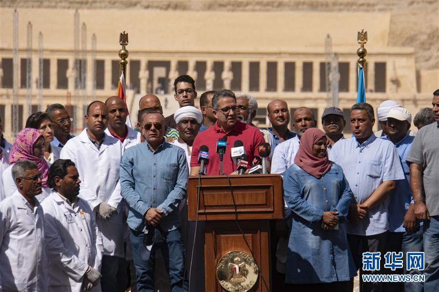 10月19日,在埃及盧克索,埃及文物部長哈立德·阿納尼在新聞發(fā)布會上講話。 埃及文物部19日在南部城市盧克索舉行的新聞發(fā)布會上宣布,埃及考古隊近期發(fā)掘出30具3000年前的木質棺槨。 新華社記者 李碧念 攝
