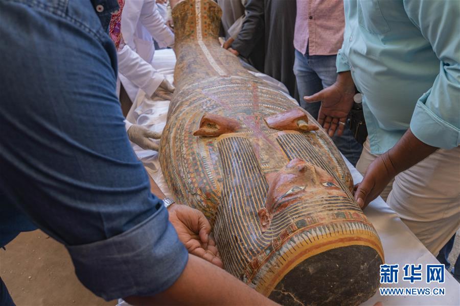 這是10月19日在埃及盧克索拍攝的近期發(fā)掘出的棺槨。 埃及文物部19日在南部城市盧克索舉行的新聞發(fā)布會上宣布,埃及考古隊近期發(fā)掘出30具3000年前的木質棺槨。 新華社記者 李碧念 攝