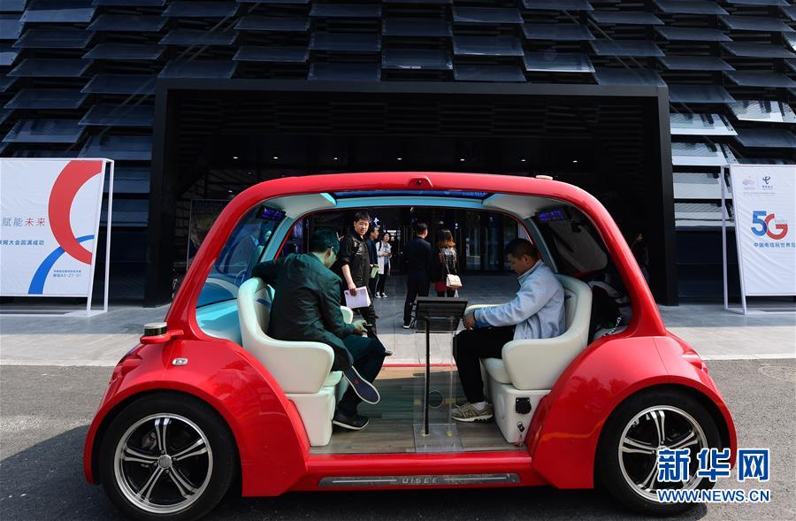 10月21日在浙江烏鎮(zhèn)舉行的互聯(lián)網(wǎng)之光博覽會(huì)會(huì)場(chǎng)外拍攝的5G無(wú)人駕駛體驗(yàn)車(chē)。新華社記者尹棟遜攝