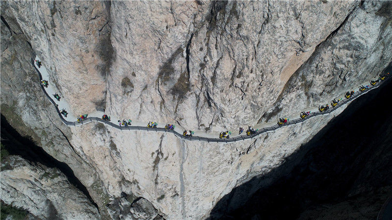 2018年4月3日,河南洛陽,志愿者在千米懸崖棧道上“飛檐走壁”,騎共享電車呼吁環(huán)保。DF/視覺中國(guó)