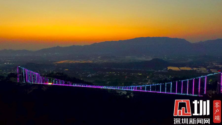 2018年10月7日,廣東佛山。網(wǎng)友紛紛稱佛山南丹山玻璃橋是廣東最美玻璃橋。漸漸地,金燦燦的陽(yáng)光變?yōu)榱顺赛S色,開始變得柔和,嫵媚動(dòng)人,給美麗恬靜的群山抹上一層金光。太陽(yáng)開始脫去華麗的金絲紗裙,換上了橘黃色的時(shí)尚。玻璃橋也穿上了端莊典雅的晚禮服,露出那像蒙娜麗莎一樣迷人的笑容。
