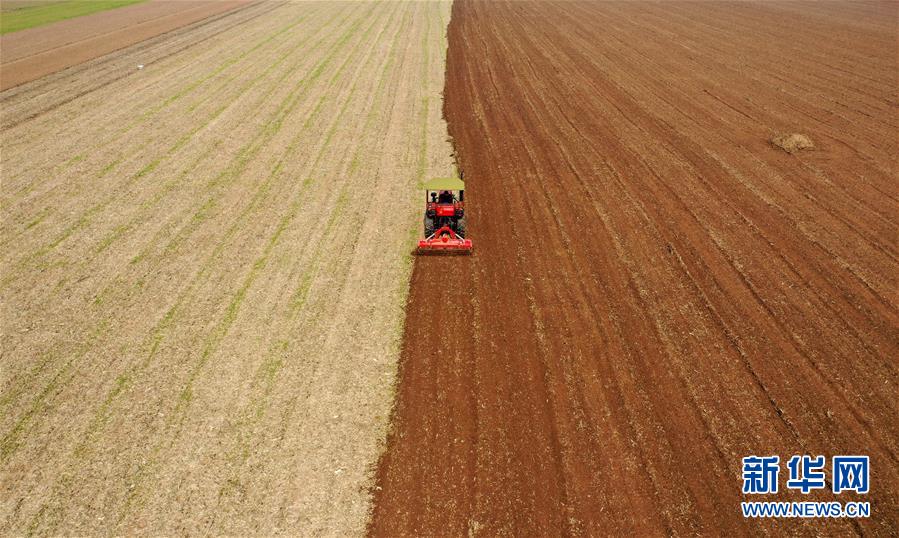 河南省寶豐縣趙莊鎮(zhèn)周營村農(nóng)民駕駛機(jī)械在農(nóng)田里犁地(10月17日無人機(jī)拍攝)。