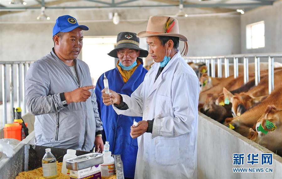 在阿里地區(qū)噶爾縣生態(tài)農(nóng)業(yè)產(chǎn)業(yè)園奶牛場(chǎng),場(chǎng)長(zhǎng)貢桑其美(左)和獸醫(yī)及飼養(yǎng)員商量牛群防疫事宜(2018年8月1日攝)。新華社記者張汝鋒攝