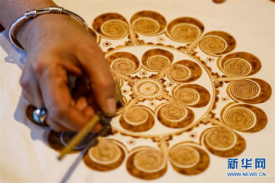 10月28日,楊芳在家中對繪好的蠟畫進行染制。新華社記者 歐東衢 攝