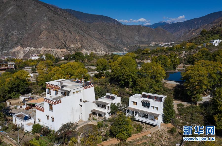 10月29日,四川省鄉(xiāng)城縣的定曲河峽谷的青德鄉(xiāng),民宿“皈院”保留了白藏房傳統(tǒng)民居特色(無人機拍攝)。新華社記者江宏景攝