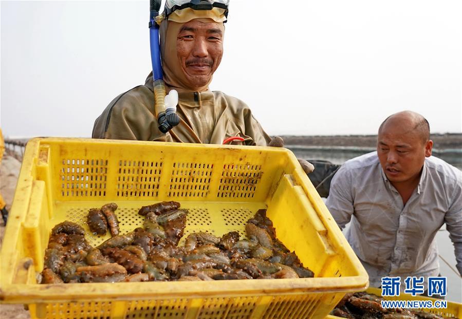10月30日,樂亭縣姜各莊鎮(zhèn)一處海參養(yǎng)殖基地的工人在展示剛捕撈的海參。 新華社記者楊世堯攝