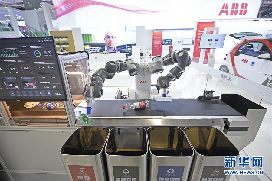 第二屆進(jìn)博會(huì)瑞士ABB集團(tuán)展出的人機(jī)協(xié)作雙臂機(jī)器人YuMi在進(jìn)行垃圾分類演示(11月5日攝)。新華社記者王鵬攝