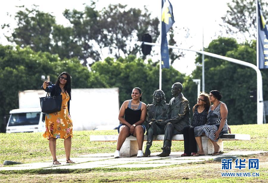 11月8日,在巴西首都巴西利亞,游客在庫比契克紀(jì)念館前與巴西前總統(tǒng)庫比契克夫婦的雕像合影。新華社記者 蘭紅光 攝