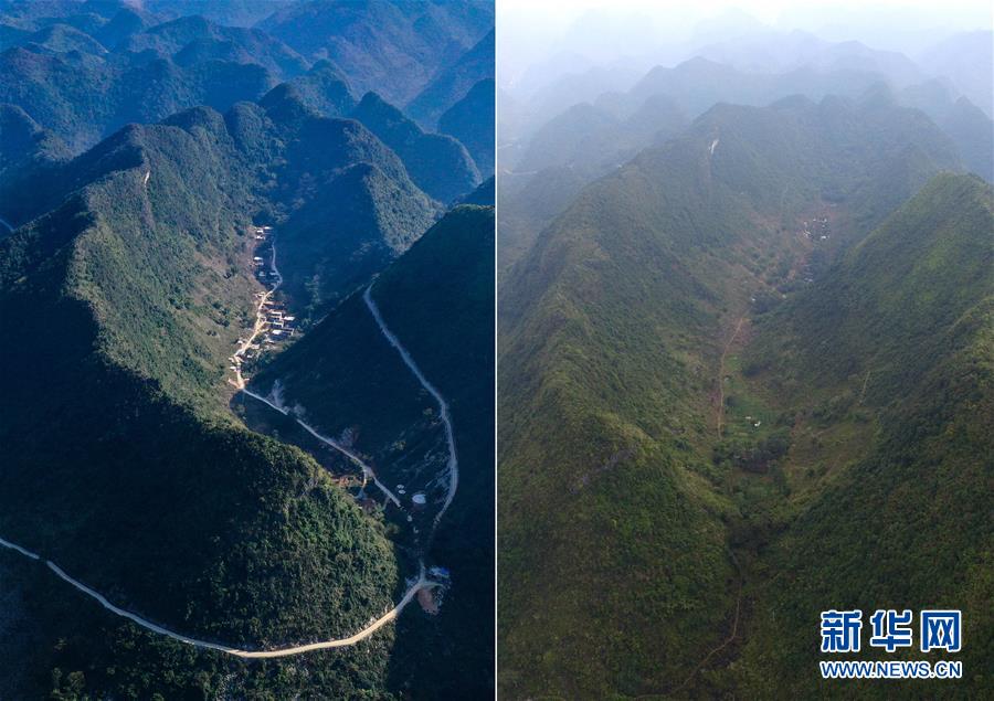 拼版照片:左圖為剛剛修通水泥路的大化瑤族自治縣板升鄉(xiāng)八好村弄研屯(11月11日無人機拍攝);右圖為尚未通路的八好村弄研屯(2015年11月3日無人機拍攝)。新華社記者 黃孝邦 攝