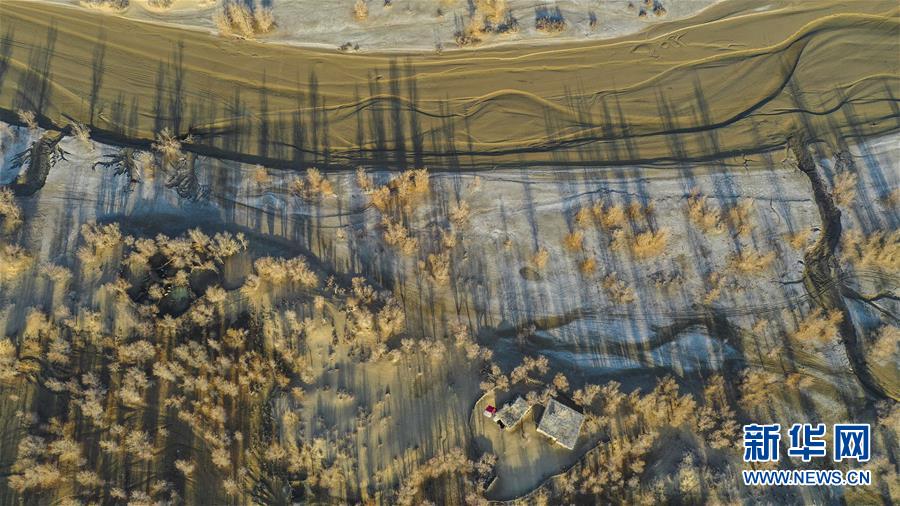 這是位于克里雅河尾閭的民居及胡楊林(11月16日無(wú)人機(jī)拍攝)。 新華社記者 胡虎虎 攝