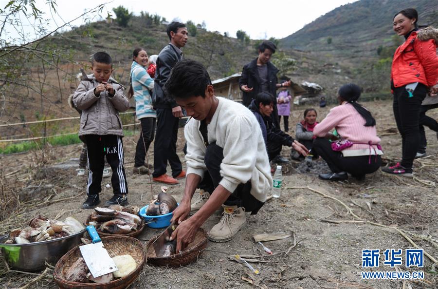 11月24日,在昭覺(jué)縣支爾莫鄉(xiāng)阿土列爾村,阿紅在切煮熟的豬肉和羊肉,準(zhǔn)備跟鄰居分享。新華社記者江宏景攝