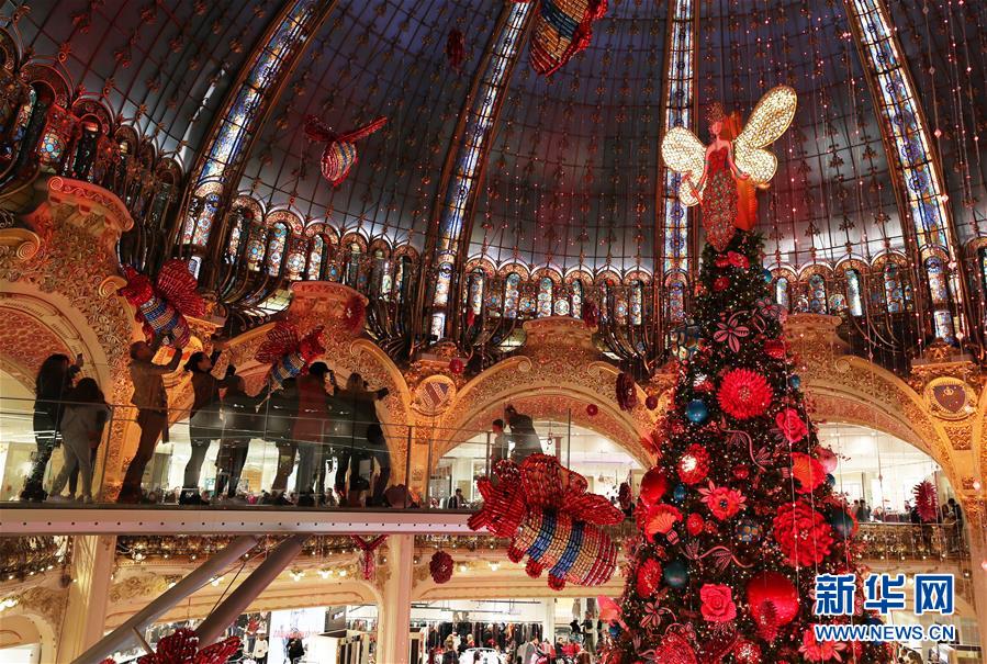11月24日,在法國(guó)巴黎老佛爺百貨公司,人們?cè)诓Aё呃壬蠀⒂^點(diǎn)燈后的巨型圣誕樹。 新華社記者高靜攝