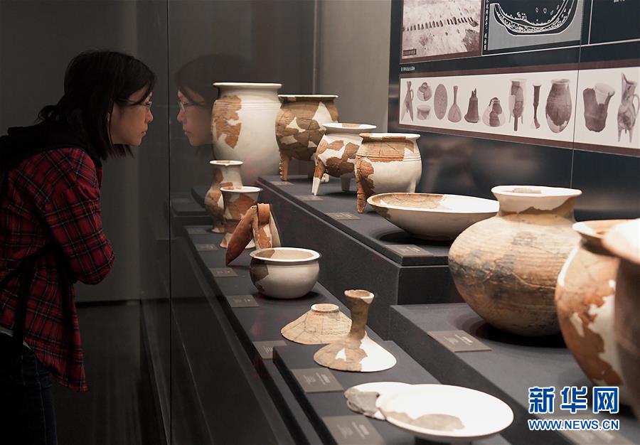 10月19日,參觀者在二里頭夏都遺址博物館內觀看展出的陶器。新華社記者李安攝