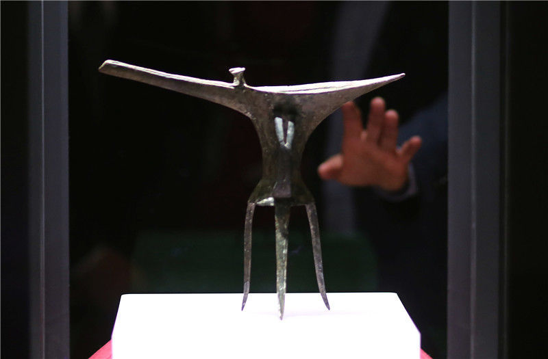圖為參加開館儀式的專家學者參觀“鎮(zhèn)館之寶”之一的乳釘紋銅爵酒禮器(夏,二里頭文化四期)。