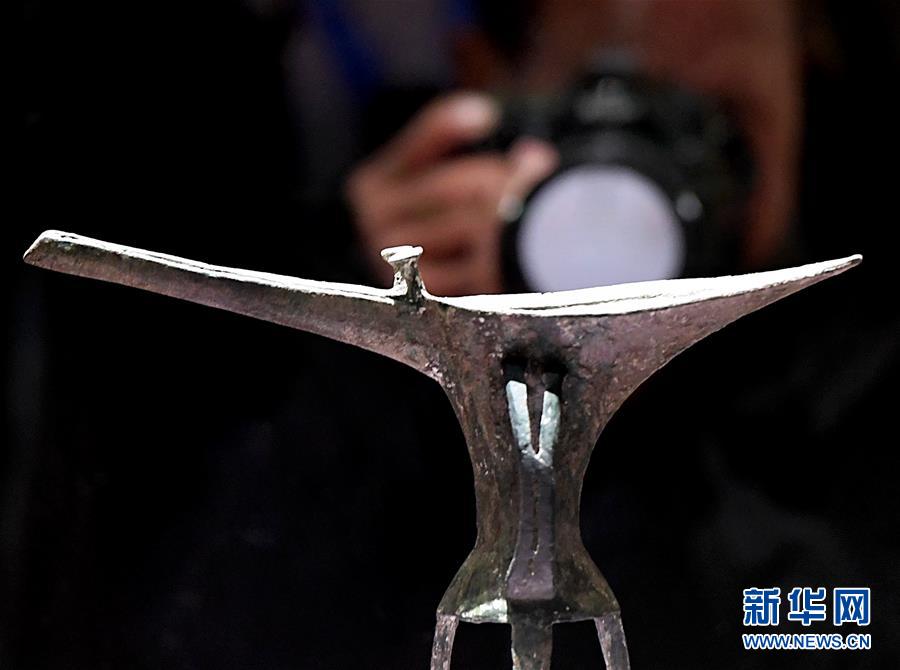 10月19日,參觀者在二里頭夏都遺址博物館內拍攝展品“乳釘紋銅爵”。新華社記者李安攝