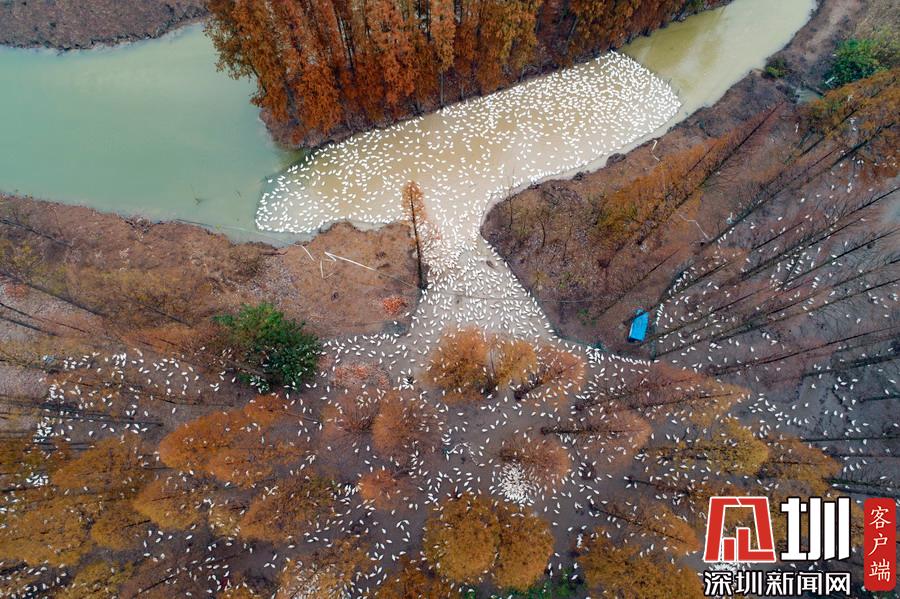 2019年12月1日,江蘇省宿遷市泗洪縣,航拍5000多只四季鵝在陳?ài)琢謭?chǎng)的樹(shù)林下吃食的壯觀(guān)場(chǎng)景。