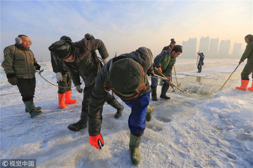2018年12月11日,黑龍江省哈爾濱市,松花江上,采冰者們彎腰拉繩,宛如纖夫般拽重達(dá)半噸的冰塊出水。采冰者都是自哈市江北萬(wàn)寶、東發(fā)、沙陀子等鄉(xiāng)鎮(zhèn)的農(nóng)民,他們每年冬閑時(shí)都會(huì)親屬、村鄰之間結(jié)伴到松花江畔采冰,有的采冰人,已經(jīng)連續(xù)干了二十多年。每個(gè)采冰季,他們每天要在冰面上工作10-12個(gè)小時(shí),每個(gè)采冰組,一天要拽出冰塊2000-3000塊,一個(gè)近20天的采冰季,每人能收入近萬(wàn)元。視覺(jué)中國(guó)